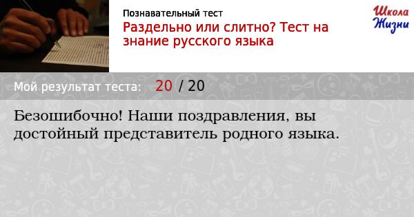 Тест отличный как по форме, так и по содержанию. Всегда кляну себя за безграмотность (здесь 14/20). Обидно то, что пишу много, а результат всегда средненький ...
