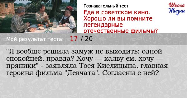 «Какая гадость эта ваш заливная рыба» и «Федя, дичь» – слишком просто для таких знатоков, как вы. Фильмы известные, гастрономические сцены тоже.