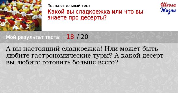 Сладкоежка я - никакой, поэтому ответила только на половину вопросов. Но ведь не возбраняется проходить тесты и только для того, чтобы узнать правильные ответы, правда?