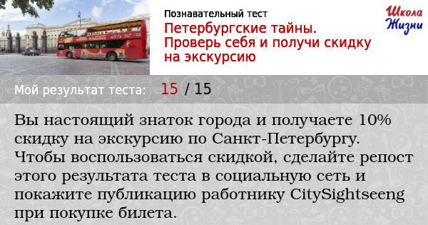 Северная столица скрывает немало интересного, поэтому экскурсионные туры по городу популярны как среди туристов, так и среди коренных жителей. Ответив правильно на 10 и более вопросов теста, вы получите 10% скидку на экскурсию по Санкт-Петербургу.