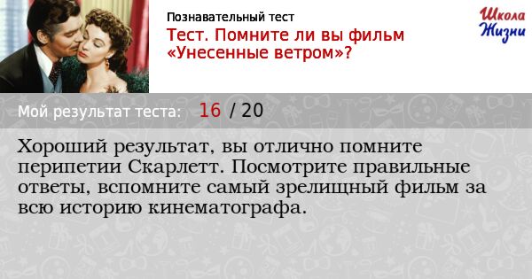 Этот фильм назван одним из величайших фильмов всех времен. В 1939 году вышла американская художественная кинокартина в жанре исторической мелодрамы, снятая по одноименному роману Маргарет Митчелл. Фильм стал самым кассовым в истории кинематографа, удерживая рекорд 25 лет. История южанки Скарлетт О’Хара на фоне Гражданской войны переросла в грандиозный эпос. Над сценарием работало 15 человек, в том числе и писатель Фрэнсис Скотт Фицджеральд. Фильм снимали 3 режиссера. Вивьен Ли стала Скарлетт совершенно случайно, на эту роль пробовались 1400 актрис. Пройдите тест, вспомните любимые моменты фильма.