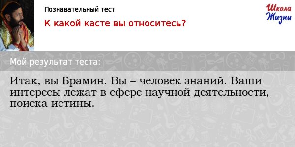 Прикольный тест.И вполне предсказуемый результат.Никогда не сомневалась, что я отношусь к браминам.Впрочем, когда я у одной своей знакомой Русского Знахаря спросила, как определить варну человека, она мне ответила:"Я не господь Бог,варны не определяю"