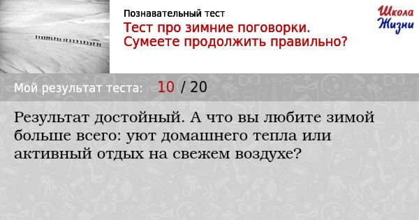 В пословицах и поговорках заключается людская мудрость, опыт и наблюдательность на протяжении многих лет и столетий. Некоторые пришли в нашу жизнь из глубокой древности, проверяясь и подтверждаясь вновь и вновь, возможно и видоизменяясь с течением времени, но не теряя смысла. Проверьте, сумеете ли вы правильно продолжить известные устоявшиеся поговорки про зиму?