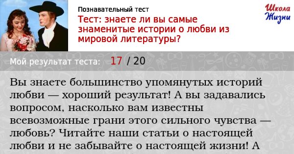 В мировой литературе весьма значительное место занимают истории о любви. Среди них есть и счастливые сказки, и очень драматичные истории, даже трагедии. Но объединяет их то, что они давно уже стали той классикой, которая лучше всего объясняет природу сложных человеческих чувств, помогает понять других, и самое главное — себя. Какие из этих литературных произведений вы знаете? Проверьте себя с помощью нашего теста.