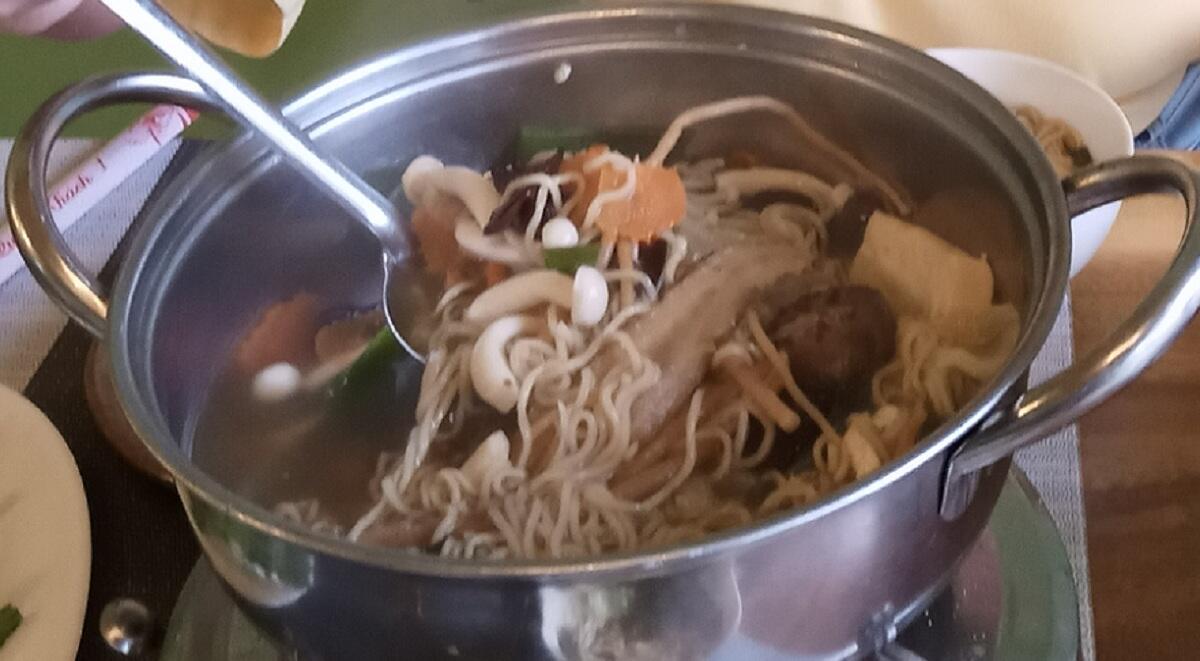 Первый раз для нас все было в диковинку, поэтому работник ресторана сделал все сам, а мы смотрели, как в кастрюлю отправляются грибы и разнообразные овощи! Супчик был чудо как хорош — в меру остренький с множеством специй, из знакомых для меня была только гвоздика и мята!