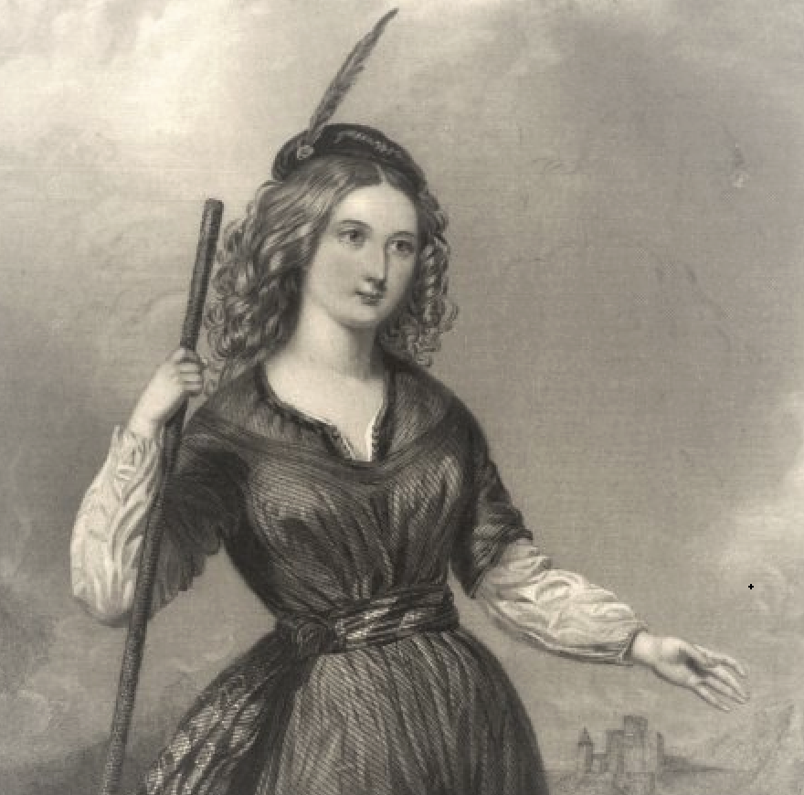 …стояла прелестная молодая женщина в персидской одежде алого цвета. На ее голове не красовалось никакого головного убора, кроме ленты, продетой сквозь волосы и прикрепленной золотой пряжкою. Сама же пряжка была украшена огромным опалом, который при разнообразии цветов, свойственных сему камню, сиял красноватым оттенком, «подобным огненной искре».