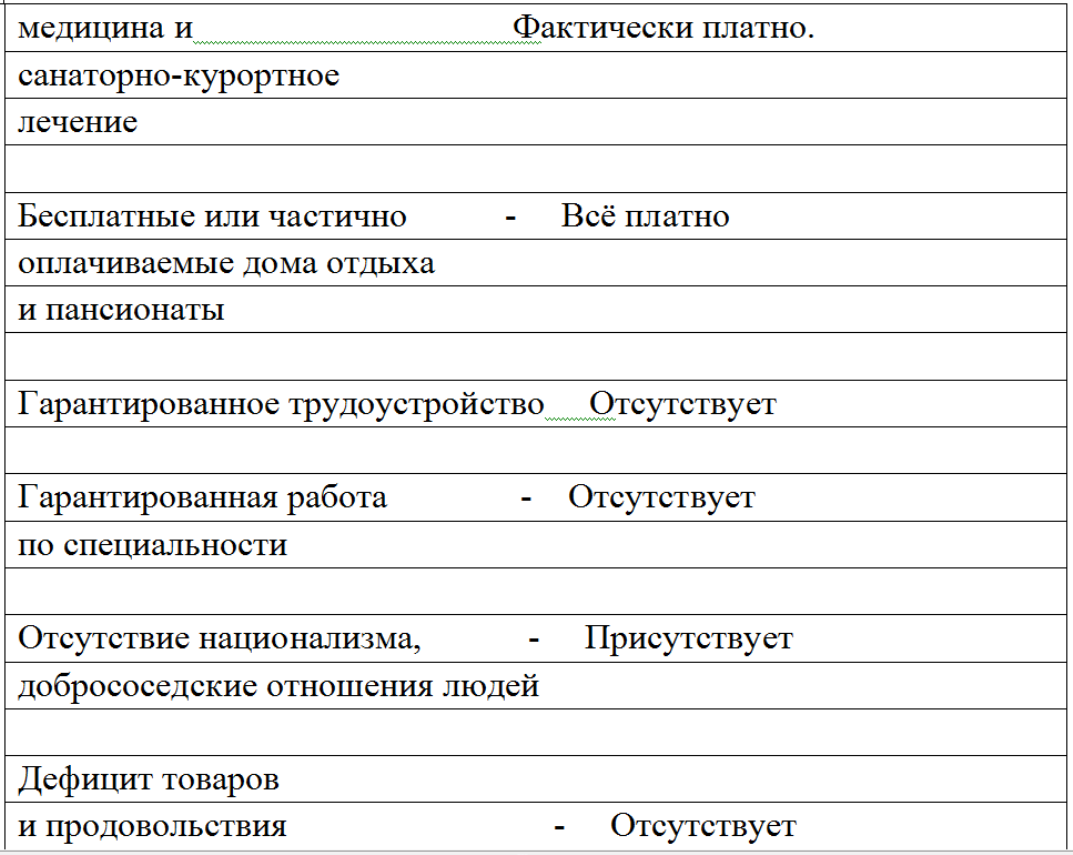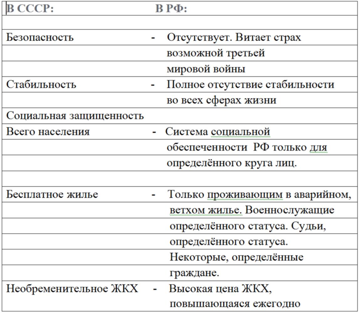 Обычное совкодрочерское враньё составленное из тупых пропагандистских штампов. Например "бесплатное жильё" какового в природе не существовало - было государственное жильё сдававшееся гражданам в "социальную" аренду. Аренда была дешёвой, но за неё надо было платить, "бесплатно" и по очереди давалось только право на такую аренду. Кстати социальная аренда и сейчас существует для многодетных инвалидов итп категорий граждан, так же у некоторых ведомств как и в советские времена есть ведомственное жильё.