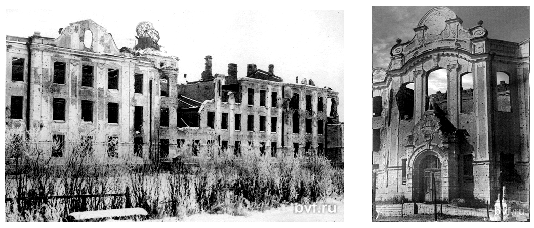 За время боёв архитектурный ансамбль был разрушен. Многие здания и сооружения восстановлению не подлежали, как, например, корпус химико-технологического факультета, располагавшийся напротив школы, где я учился. От него осталась груда кирпичей, но главный корпус восстановили. Многое потеряно безвозвратно. У меня в архиве хранятся довоенные фото и фото разрушений, которые увидели мои родные, вернувшиеся из эвакуации в 1944 году.