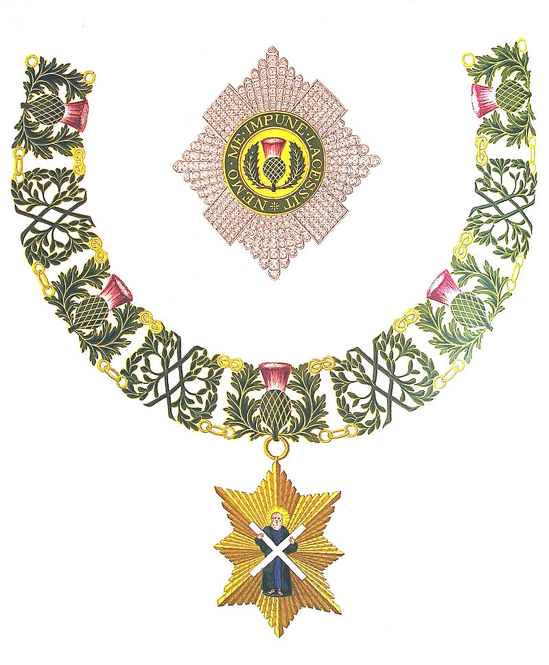 По определённым дням (ежегодная орденская служба, коронация) рыцари и дамы облачаются в орденское одеяние: зелёную мантию и шляпу. Поверх мантии надевается золотая орденская цепь, звенья которой изображают чертополох и побеги руты.