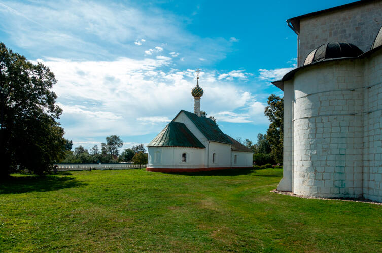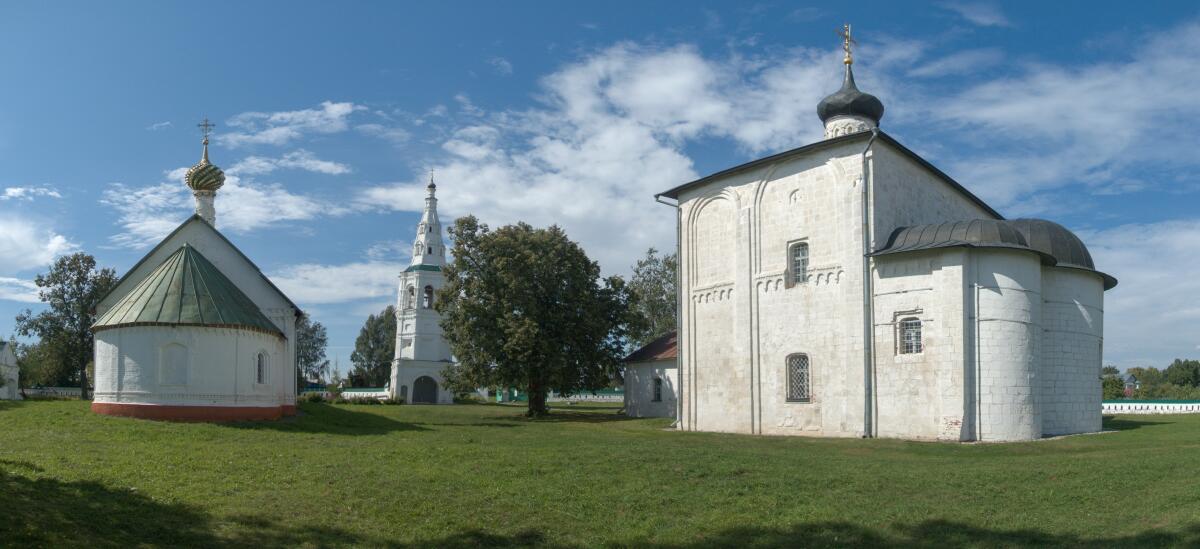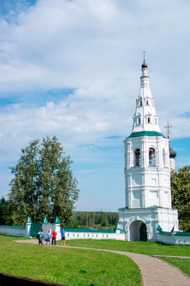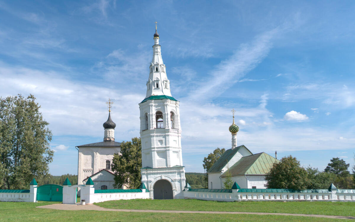 Колокольню называют Суздальской Пизанской башней. Высокая шатровая колокольня, построенная в 1780 году, со временем сильно накренилась в сторону, примерно на 6 градусов. И в таком устойчивом положении находится уже многие годы. Колокольня стоит отдельно от храмов, к ее входу с обеих сторон примыкает каменная ограда.