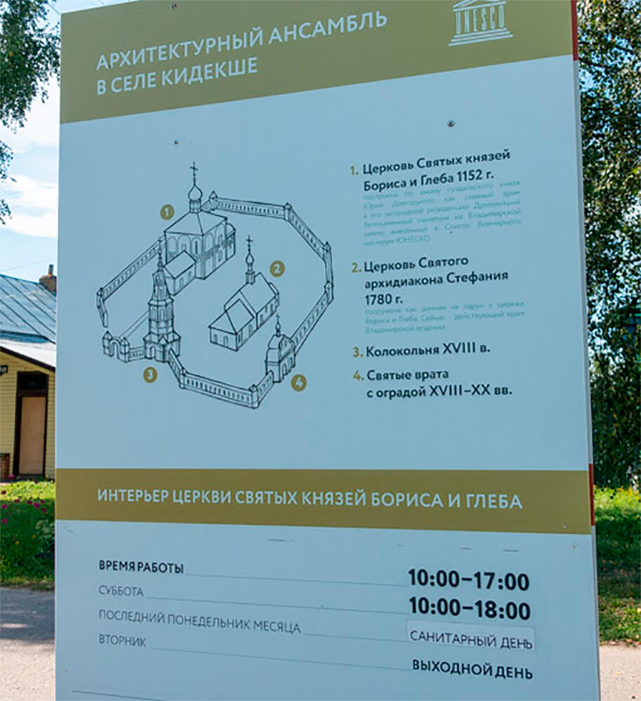Здесь их встречает План расположения основных объектов на территории Борисоглебского храмового комплекса и график осмотра интерьера Церкви Святых князей Бориса и Глеба:
