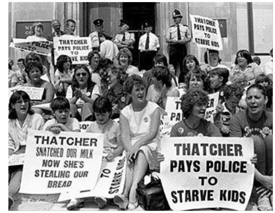Британская пресса окрестила своего премьер-министра Маргарет Тэтчер «Thatcher, Thatcher, Milk Snatcher» («Тэтчер, Тэтчер, похитительница молока») за поддержку закона отмены программы, по которой каждому ученику старше 7 лет в школе полагалось бесплатное молоко.