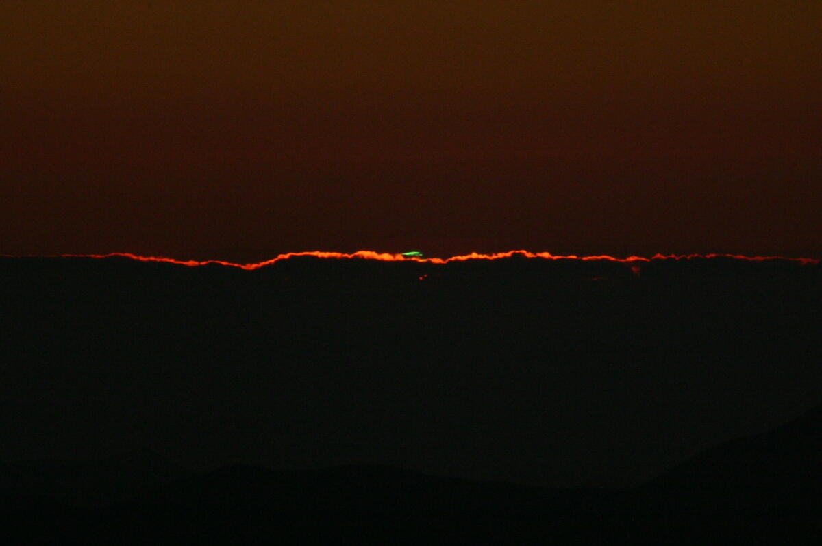 Красный же цвет отклоняется в момент захода незначительно, и поэтому быстро пропадает, а зелёный — ненадолго остаётся. Вот и светится краешек солнечного диска зелёным цветом.