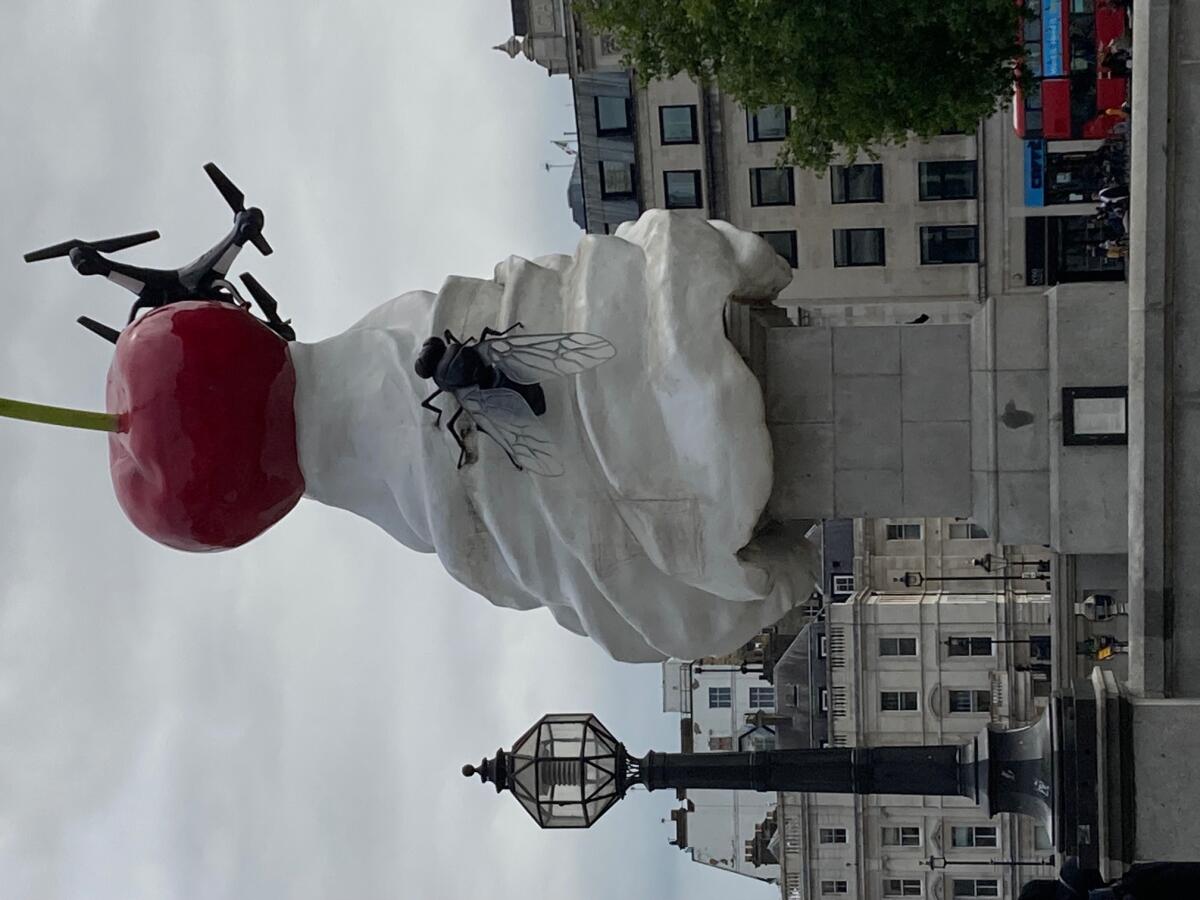 Я был в Лондоне не один раз. Но даже не мог себе представить, что на Трафальгарской площади, уставленной монументами великих людей Британии, появится «скульптура» в виде стаканчика пломбира с вишенкой на вершине пирамидки и сидящей на этой пирамидке гигантской «мухой». Скульптура была установлена рядом с Британской галереей. Естественно, ее мы не могли пропустить. Отдохнули душой, созерцая бессмертные творения гениев планеты.