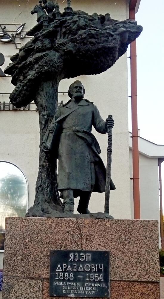 Путешествуя по Минску, проходим по Троицкой набережной и встречаемся с памятником гению белорусской культуры. Скульптурная композиция запечатлела Язепа Дроздовича во всех его жизненных ипостасях, как «вечного странника». Он шагает по дороге с посохом, а через плечо переброшен мольберт. Одет просто. Он рядом с деревом, в ветвях которого спрятаны его мечты.