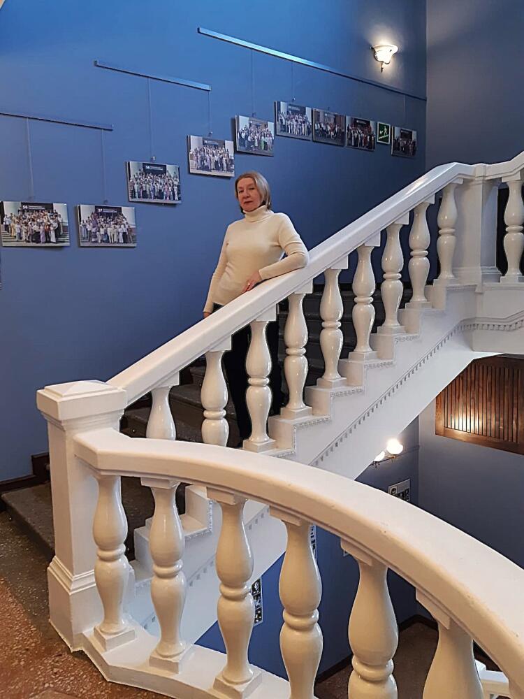Стены на лестнице и в фойе оформлены в синих тонах, на них размещены фотографии артистов театра и сцены из спектаклей.