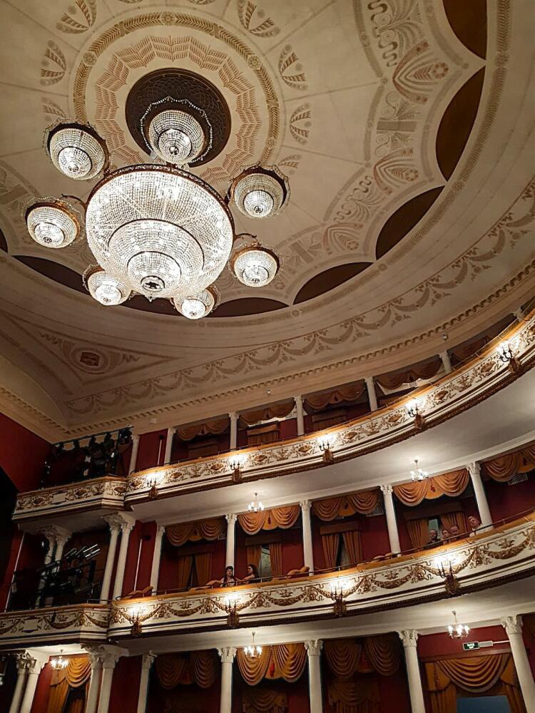 Оставив в гардеробе верхнюю одежду, мы с подругой отправились осматривать театр. Все выглядело внушительно: торжественно и парадно. Поднявшись по массивной лестнице с белыми перилами, оказались в фойе второго этажа с… традиционным для многих театров белым роялем.