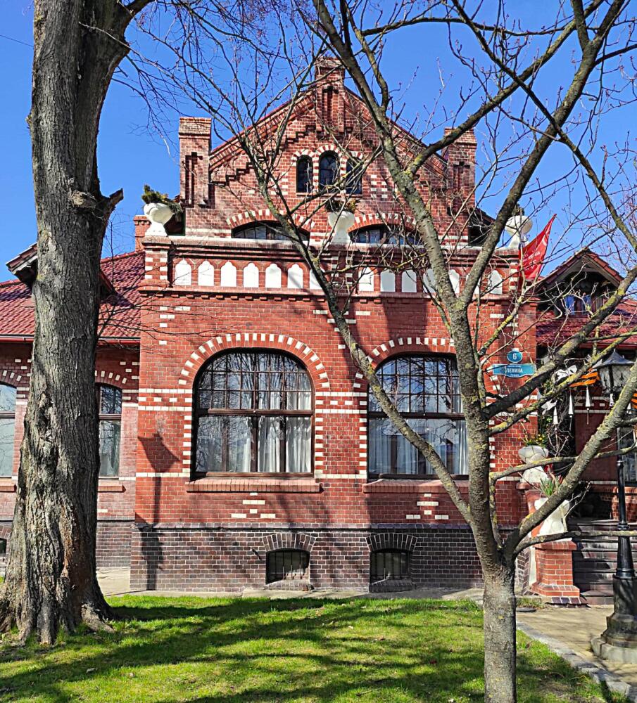 Наша пешеходная экскурсия по Зеленоградску началась в центре города, недалеко от железнодорожного вокзала, где расположен прекрасно сохранившийся памятник архитектуры начала ХХ века «Вилла Крелля». Название вилла получила от фамилии одного из её владельцев, нотариуса и адвоката Макса Крелля. У виллы два входа. Парадный вход предназначался для клиентов нотариальной конторы, а вход со двора — для домочадцев.