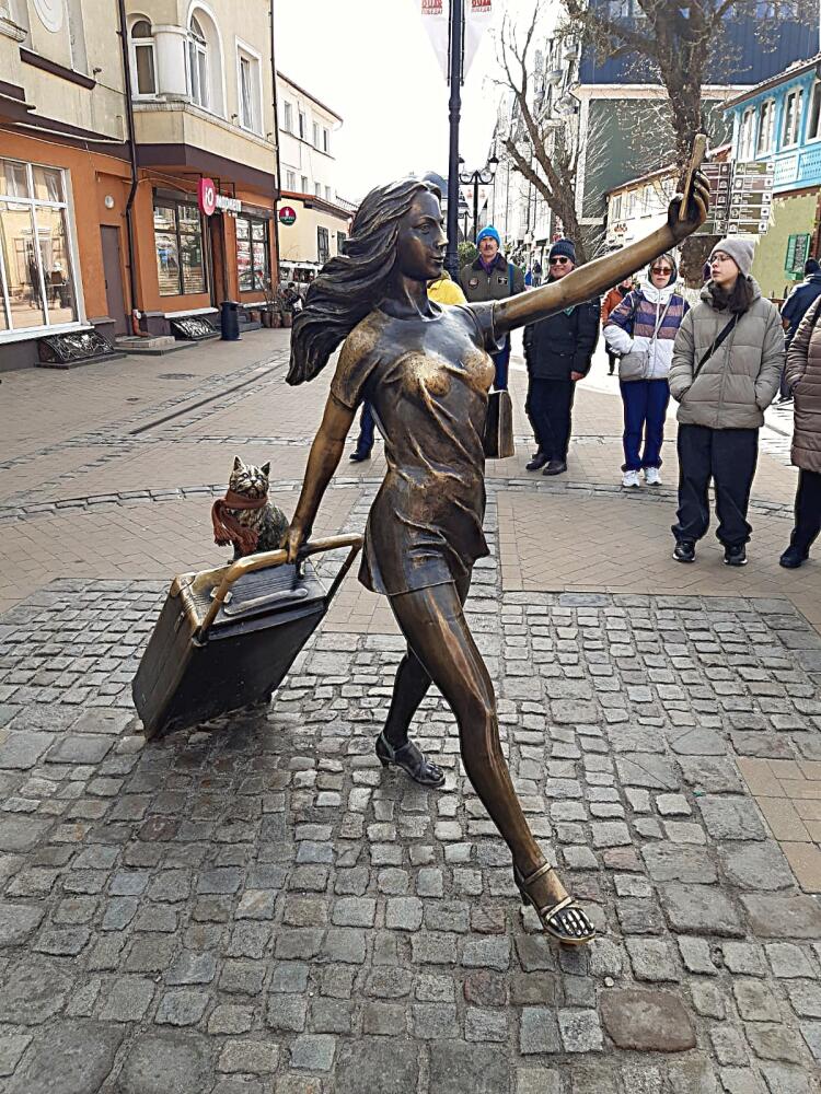 Дальше по проспекту находится современный арт-объект «Курортница», установленный в Зеленоградске в 2020 году. Он изображает девушку, держащую в вытянутой руке телефон, снимающую селфи и одновременно везущую за собой огромный чемодан на колесиках, на котором примостился безбилетный пассажир — кот. Композиция изготовлена из стеклопластика и покрыта патиной под бронзу. «Курортница» быстро приобрела популярность у туристов и горожан.