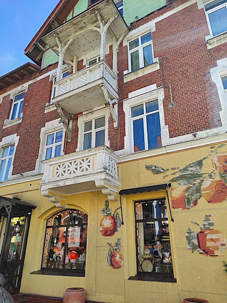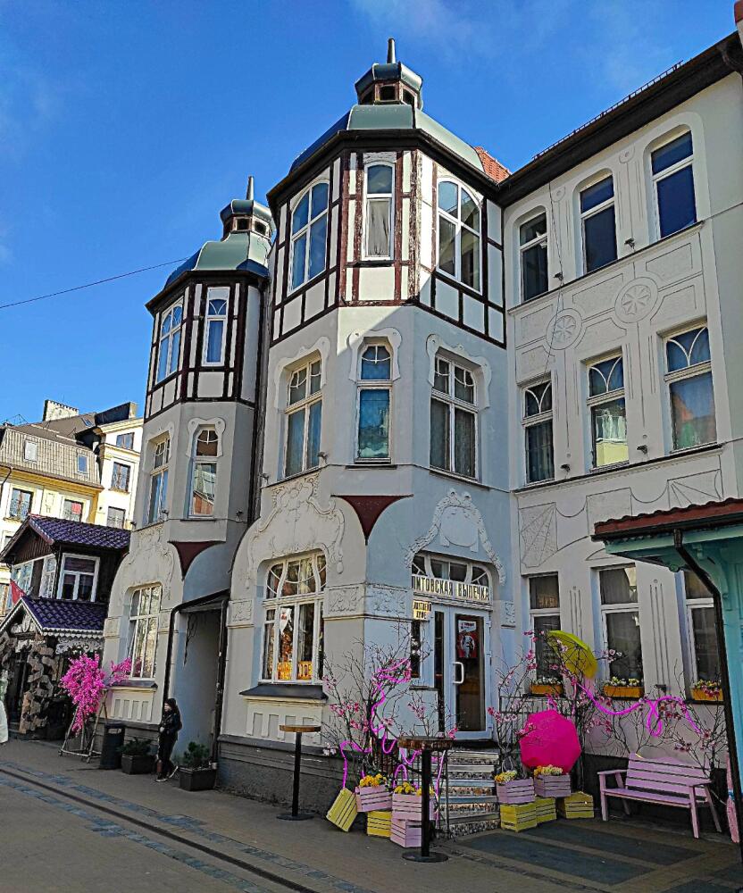 Продолжая прогулку по пешеходной зоне Курортного проспекта, мы подошли к историческому отелю «Курхаус Кранц», построенному в стиле фахверк с разнообразными оконными проёмами, балкончиками и башенками.