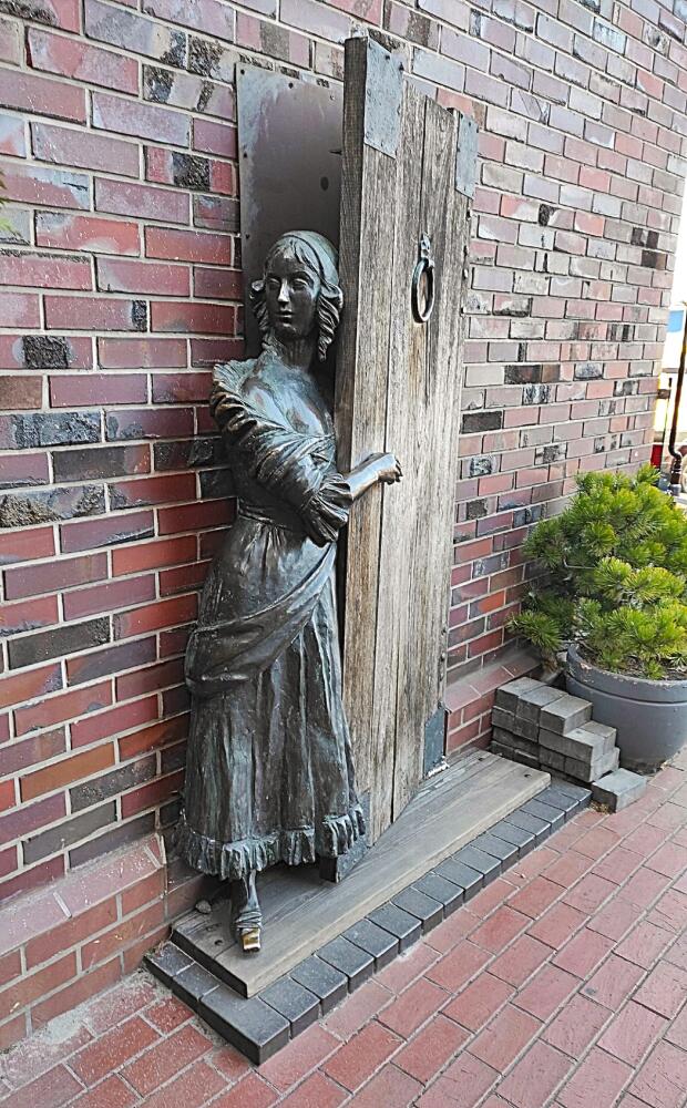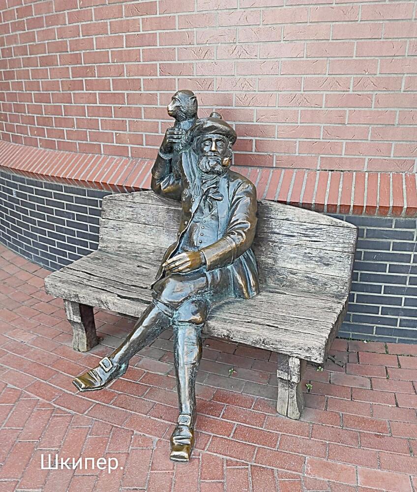 Во дворике рядом со «Шкипером» нас встретила «Трактирщица» — скульптура девушки, выглядывающей из-за двери и как будто приглашающей заглянуть в её заведение. Есть разные версии, что может изображать эта скульптура. Трактирщица открыла дверь на стук постояльца и вышла его встретить. А может быть, это рыбачка, увидевшая своего мужа, возвращающегося с уловом? Любая интерпретация имеет право на жизнь. И каждый волен выбрать ту, которая ему больше по вкусу.