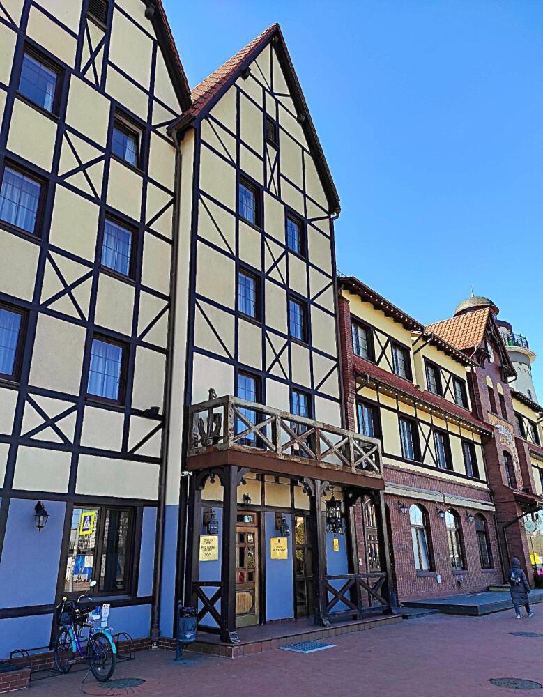 Здания и скульптуры в комплексе «Рыбной деревни» расположены компактно. Наша экскурсия началось с «Речного вокзала», в котором обосновался калининградский бизнес-центр, и гостиницы «Шкиперская».