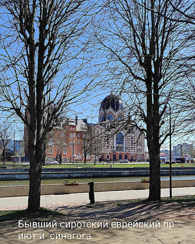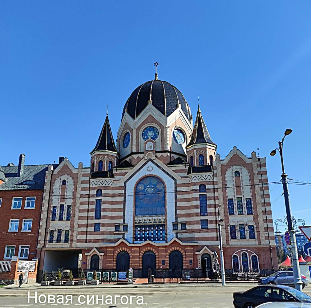 Красивейшее здание синагоги, которое сразу привлекает внимание, вновь воссоздано в 2018 году на месте бывшей Новой либеральной синагоги Кёнигсберга, построенной здесь же, на тогдашней Линденштрассе, в 1896 году и сожженной, но не разрушенной до основания, 9−10 ноября 1938 года, во время «Хрустальной ночи» — организованного и скоординированного еврейского погрома на всей территории нацистской Германии, в части Австрии и в Судетской области. С 1935 по 1942 год в её стенах размещалась школа для еврейских детей. Окончательно здание было разрушено в ходе бомбардировок 1944 года.