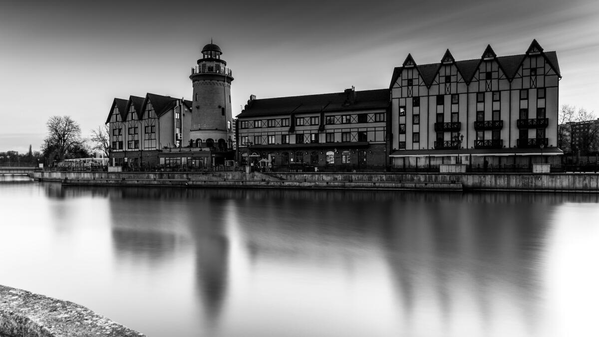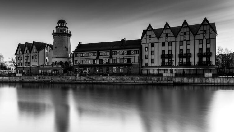 Здание «Речного вокзала» — не историческое, новодел, стилизованный под вокзал XIX века. Рядом с ним находится причал, откуда за 700 рублей можно прокатиться на прогулочном катере по Преголе и полюбоваться «Рыбной деревней» с воды.