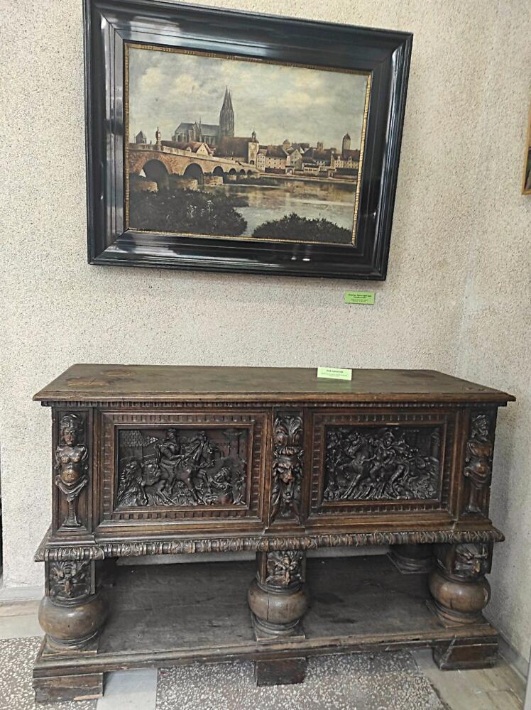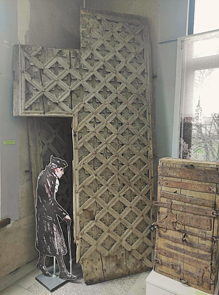 Чего только нет в этом зале! Образцы старинного оружия, в том числе и русской императорской армии, мебели, бытовых предметов. Особо ценный (как мне показалось) экспонат — карманные солнечные часы, корпус которых выполнен из кости. Кожаный сапожок XV века, инвентарные книги бывшего музея «Пруссия» с описаниями предметов археологии из собрания Королевского замка, даже… древняя-предревняя дверь. Самого начала XV (!) века!