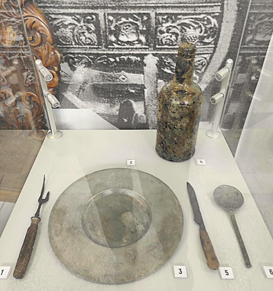 По соседству с панно — коллекция столовых приборов жителей Кёнигсберга XVIII века, состоящая из посуды, собственно приборов, бутыли для вина. Поскольку, по некоторым источникам, широкое распространение в Северной Европе вилка получила именно в XVIII веке, нам стоит только догадываться — это самая обычная двухзубцовая вилка или, поскольку на столе стоит бутыль с вином, специальная вилка для закусок.