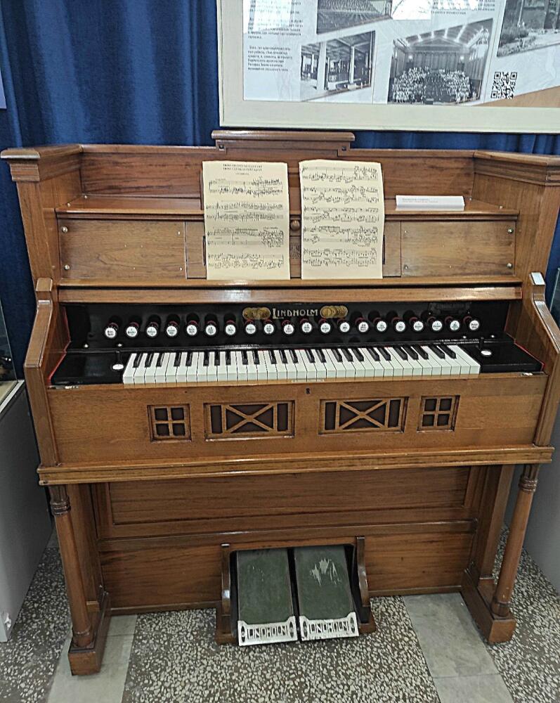 Чуть в стороне от столовых приборов стоит резной шкаф-ларец XVII века, изготовленный в Германии, и фисгармония Lindholm — музыкальный клавишно-пневматический инструмент из семейства гармоник, но имеющий не кнопочную, а клавишную клавиатуру, в связи с чем внешне сильно напоминает пианино, но меньшего размера. Для фисгармонии характерно певучее, спокойное звучание, напоминающее орган. Музыкант нажимает одну за другой педали, чтобы привести меха в движение, и играет на клавишах.