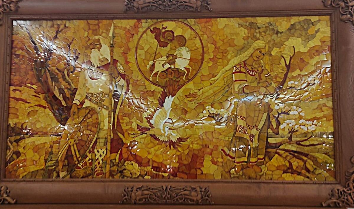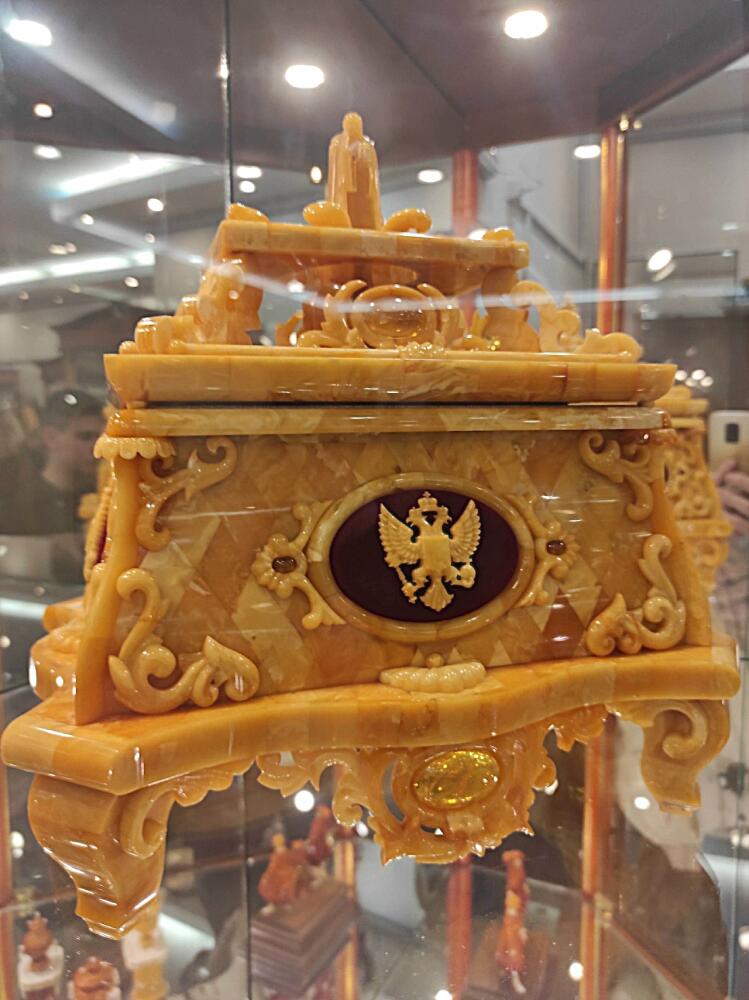 Великолепна янтарная шкатулка пирамидальной формы, украшенная двуглавым орлом — гербом России и увенчанная миниатюрной скульптурой Георгия Победоносца из белого янтаря. Она была изготовлена в 2002 году в качестве подарка нашему Президенту.