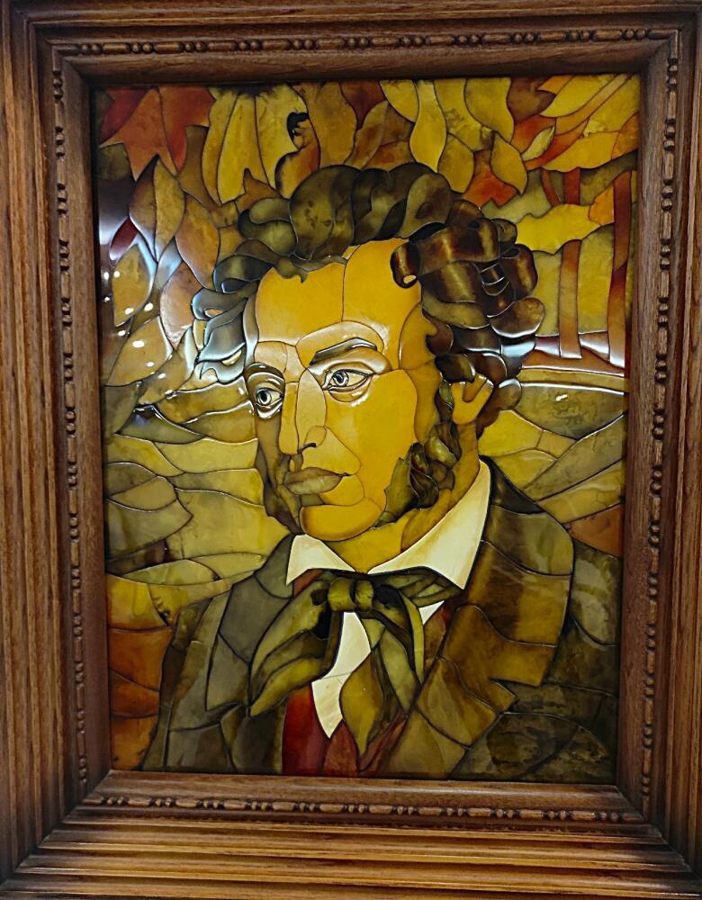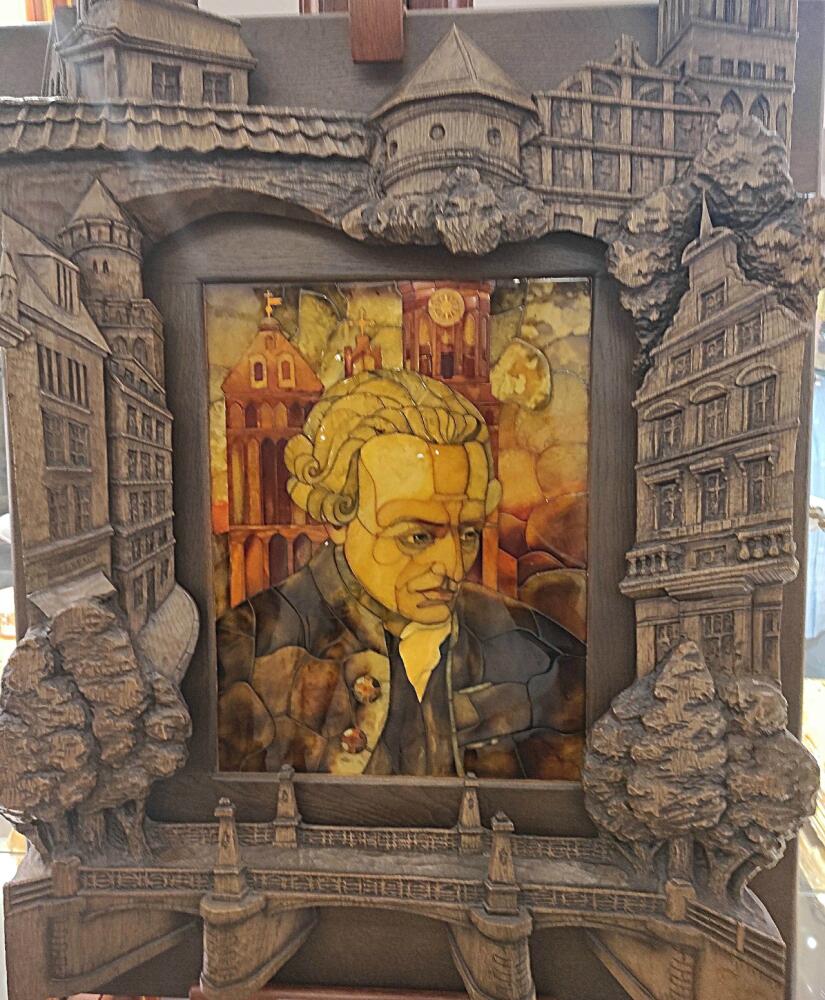 Например, Иммануила Канта, на котором великий философ изображен задумчивым и сосредоточенным, на фоне кёнигсбергского Кафедрального собора, у стен которого он похоронен. Или портрет Александра Сергеевича Пушкина: поэт во время прогулки в селе Болдино. Оба портрета выполнены в мозаике из колорированного янтаря.