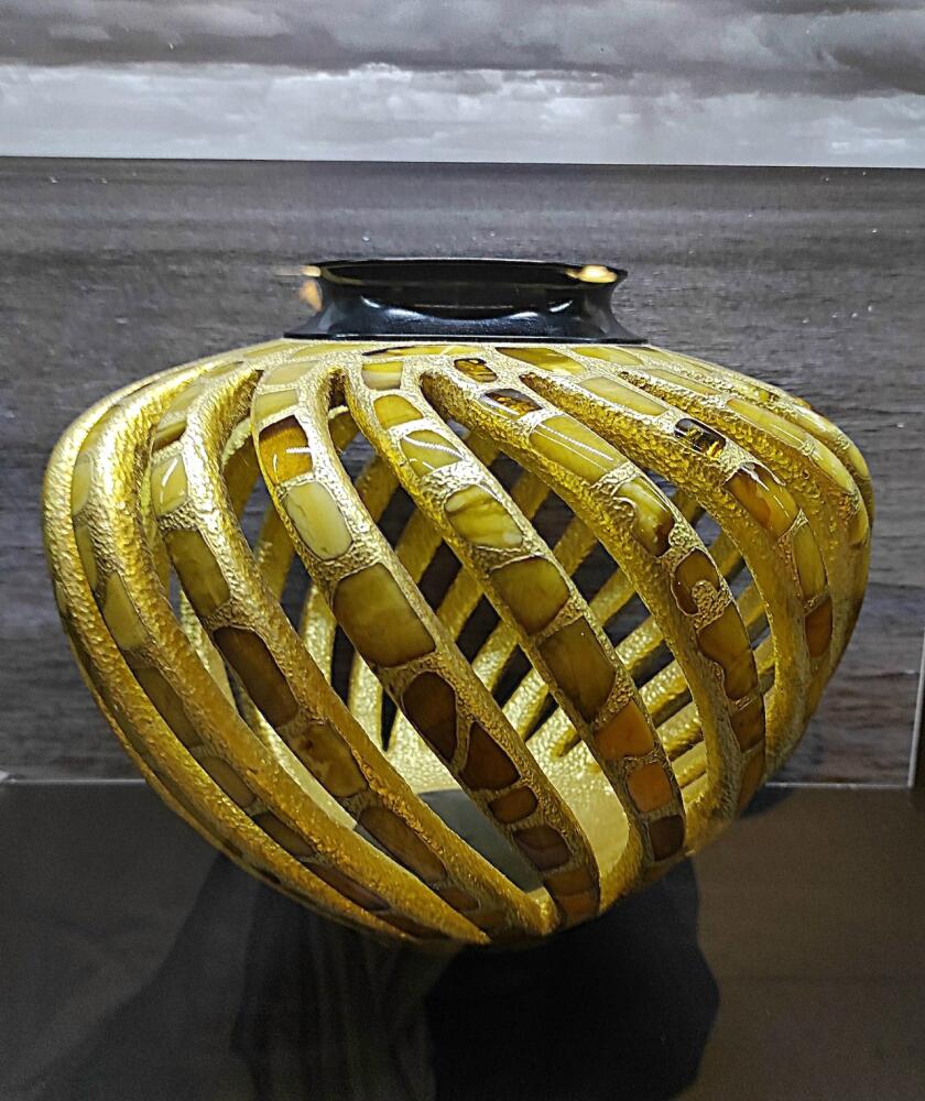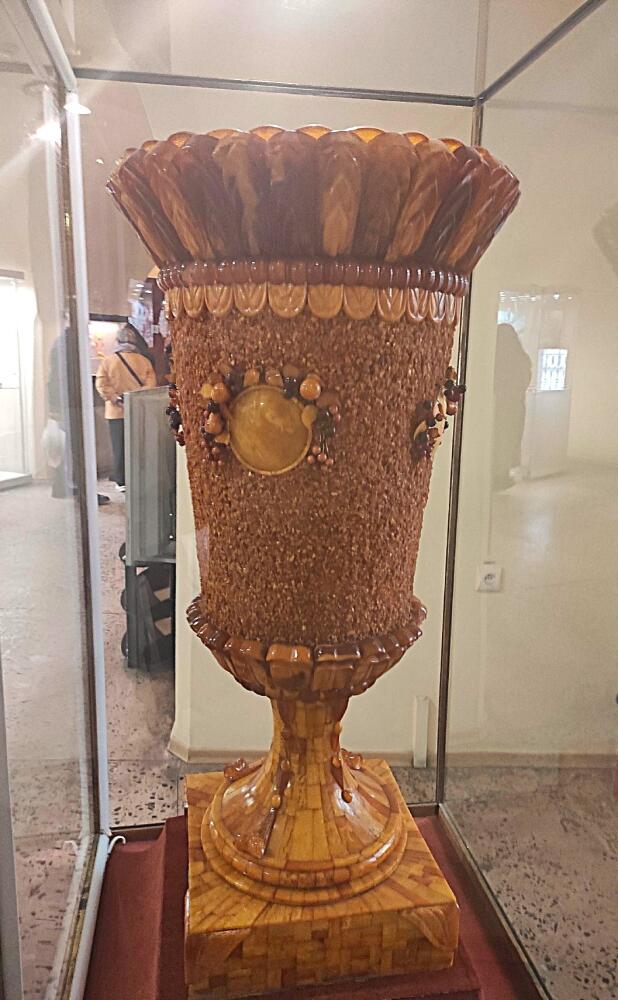 Своей красотой и размерами наше внимание привлек образец крупногабаритного изделия, изготовленного художниками янтарного комбината — ваза «Изобилие», высотой более метра.