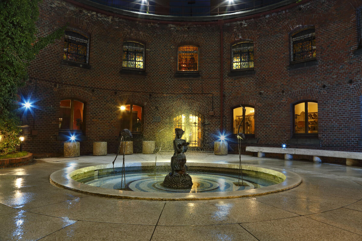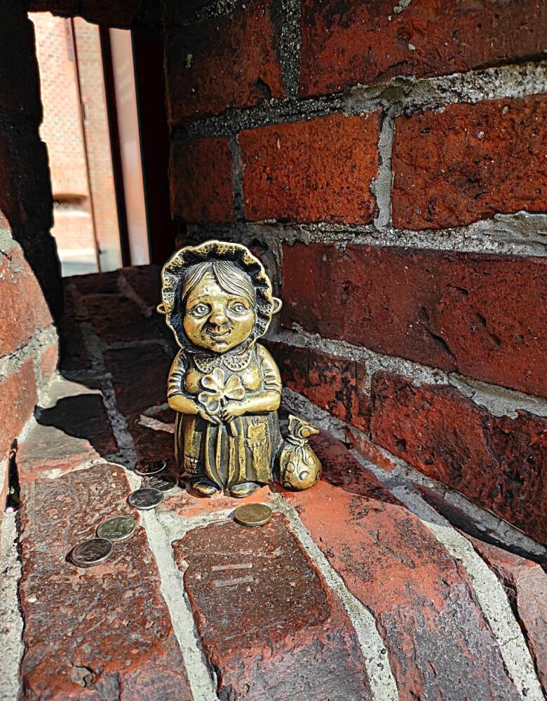 Бабушка в красивом чепчике с трехлистным клевером в руках приютилась в одной из бойниц башни Дона у входа в Музей янтаря. Рядом с ней стоит мешочек, наполненный тайным содержимым. Возможно, там лекарственные травы, которые она собирает для приготовления снадобья, а может, разноцветный янтарь, или старушка складывает в него монетки, которые оставляют путешественники, с надеждой ещё не раз вернуться в Калининград.