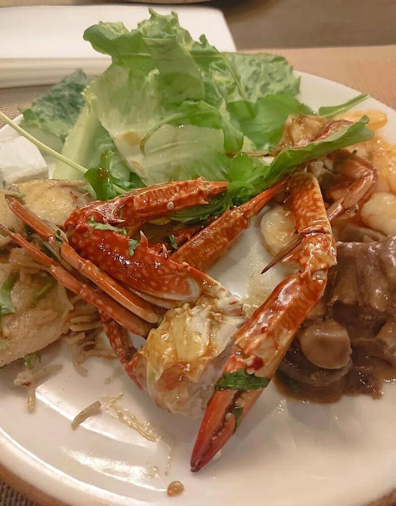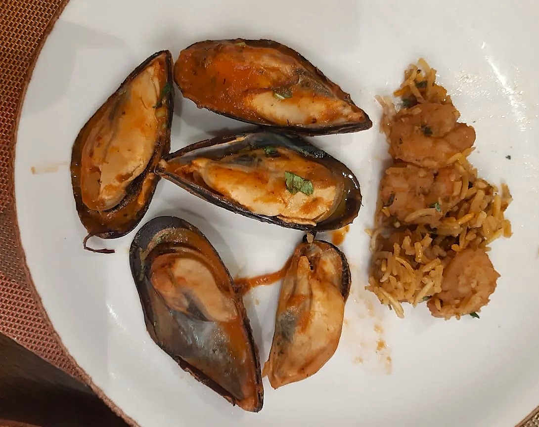 Кроме мясных, овощных и рыбных блюд, были морепродукты: запеченные крабы, мидии и рагу из морепродуктов по-тайски, в состав которого входили разнообразные морепродукты, овощи, пряности — и все это в кисло-сладком соусе.