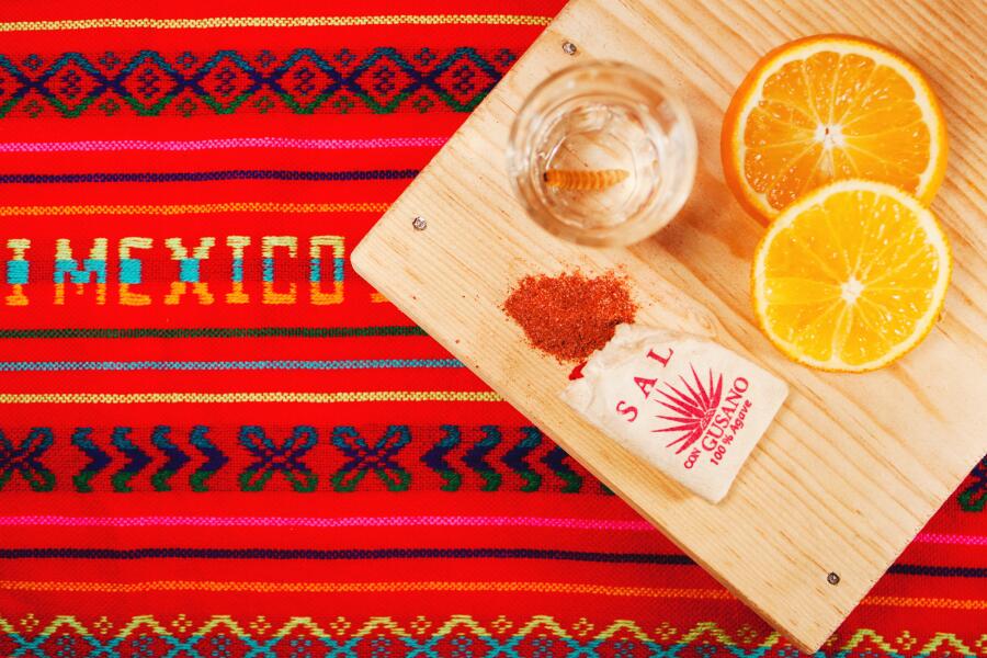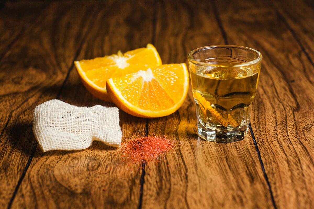 Мескаль в рюмочке с червяком и апельсиновые дольки с солью Фото: Depositphotos