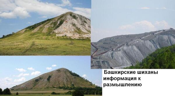 Башкирские шиханы это терриконы.Характерными признаками Башкирских шиханов и многих терриконов является наличие пологого склона, с углом наклона около 30 градусов, идущего от вершины до основания и естественных осыпей. Такое сочетание качеств нельзя приписывать факторам неизбирательного действия,стихиям.