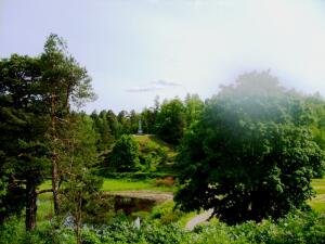 Укрепления строились для защиты города с северной стороны, по проекту генерал-майора де Кулона — с 1731 по 60-е годы XVIII века. Мощные стены, напоминающие валы из гранитных глыб, и глубокие рвы прекрасно сохранились, так как эти укрепления ни разу не использовались в боевых действиях. Сейчас стены поросли деревьями и кустарниками, на ровной площадке между двумя валами устроен аттракцион-автодром. В стенах было когда-то четверо ворот, но сохранились только одни, Фридрихсганские, через них мы и продолжили путь. Вскоре по мосту пересекаем железную дорогу, ведущую в Финляндию. Рельсовый путь проложен среди вырубленного в скальных породах «коридора».