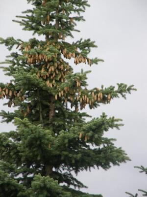 А на главной площади города, в общем-то не очень выразительной - урожай шишек на елках вон какой