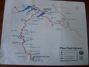 Работница информационного центра дает нам очень подробный план дороги к вершине Пайкс Пика, и еще вручает два купона на бесплатные пончики, которые мы можем получить в кафе, если доедем до вершины, до дома встреч. Выехав из Монитоу, минут через 10, сворачиваем с 24-й дороги, подъезжаем к воротам на платное шоссе. Стоимость проезда 10 долларов, как и в парке «Скалистые горы». Да, здесь нас предупредили, что надо перейти на ручную коробку скоростей, снять с автомата. И не пользоваться кондиционером (правда, мы не поняли, почему).