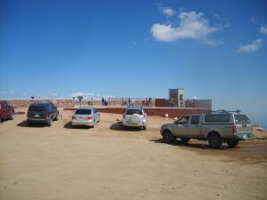 Еще 10 минут, и перед нами вершина — 4301 метр! Непередаваемое ощущение! Мы доехали! Душа освобождается от страха и ликует! Здесь довольно ровная площадка, не маленькая, возможно, поработали строители. Большая парковка, где стоят не менее полутора десятков автомобилей. Низкое приземистое здание, которое носит название Summit House — Дом встречи.