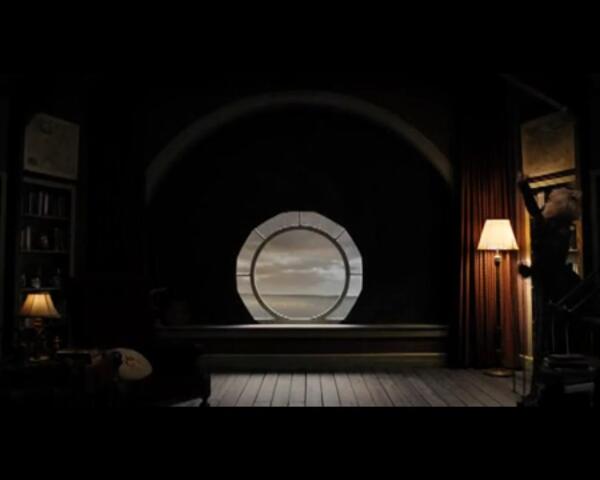 • На озеро открывается вид через огромное окно в библиотеке, закрытое вместо штор диафрагмой, тётя Жозефина открывает её, потянув за кованую цепь.