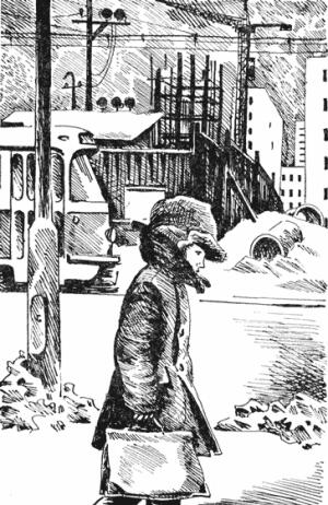 На улицах было два цвета: грязно-белый и чёрный. Грязно-белыми были многоэтажные коробки домов, обледенелый снег, подёрнутое дымкой зимнее небо. Чёрными — голые деревья, окна, заборы, телеграфные столбы, провода и трамвайные рельсы. И комья застывшей земли на пустырях. И клетки недостроенных зданий. И угольные кучи у котельных... Словно кто-то нарисовал всё на пыльном ватмане мутной тушью.