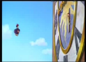 Виктор Кухновец, а в "Изгнаннике" на каждом шагу часы, циферблаты, или песочные с колбами, даже песочные часы высотой с дом. И когда принцесса София становится императрицей, то ей вручают большой ключ, она запускает некий механизм и переворачиваются большие песочные часы - в знак того, что наступает новая эпоха, после долгих лет войны, голода и лишений, что люди не будут больше воевать и будут помогать друг другу и все вместе строить новую счастливую жизнь. Под красным флагом типа (кста, серп и молот там присутствуют тоже).