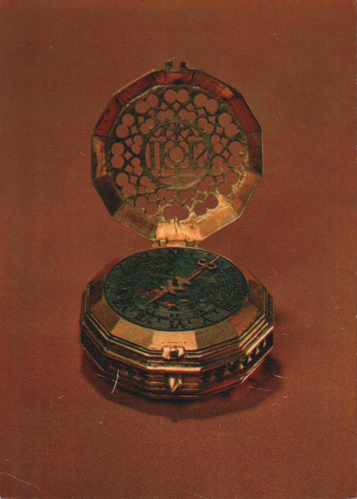 А вот часы, принадлежавшие Патриарху Никону - т.н. каретные, владелец брал их с собой в поездки. Скан с открытки из серии "Кремлёвский музей декоративно-прикладного искусства".