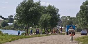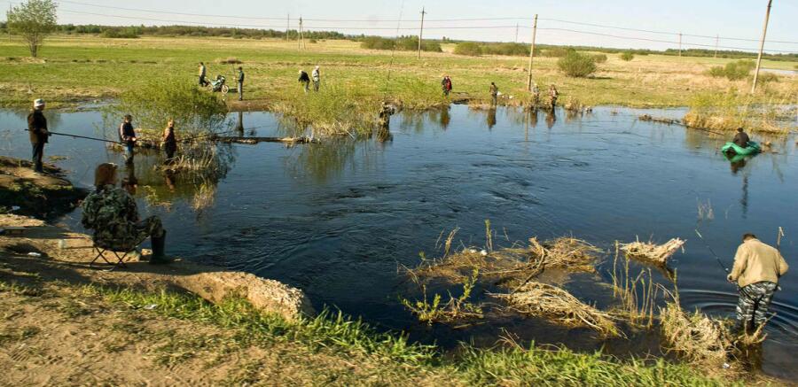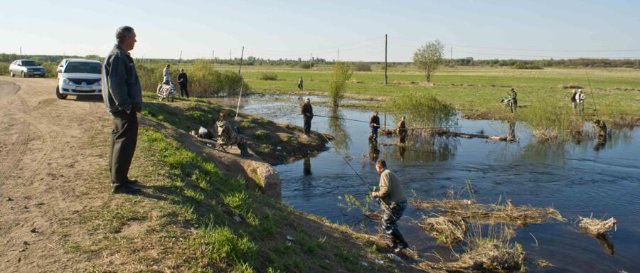 Из озера вытекает речка Векса, в устье перекрытая плотиной. Ошалевшие от сезона рыбаки съезжаются на эту речку. Слева - проезжая дорога, уставленная машинками рыбаков, сами рыбаки - в этой полуречке-полуканаве придорожной (слева ж видна труба бетонная, проложенная под дорогой для потока воды).
