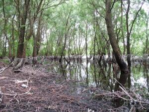 У нас на Полесье половодье - обычное дело. Вот что оставляет небольшая в общем-то речка Горынь в городе Давид-Городок. Причем разлилось старое русло, сейчас река течет по новому, которое от города отделяется дамбой. Снимок сделан в конце мая 2009 года. Белесые отпечатки на стволах - не ретушь. Так все это выглядит на самом деле.