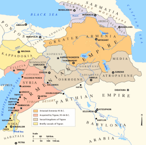 Судя по карте мира I века, Великая Армянская империя не имела выхода ни к Каспийскому, ни даже к Чёрному морю. Уж какое там Средиземное?! Это что-то новенькое в географии.