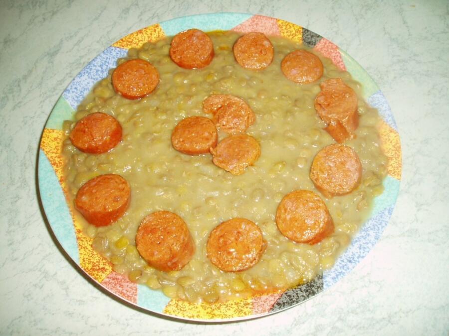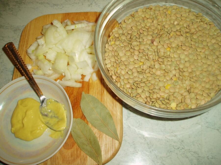 полкило чечевицы, грамм 300 копченой ветчины или окорока, одна средняя луковичка, пара зубчиков чеснока, грамм по 30 сметаны и сахара, по паре столовых ложек свиного жира и муки, одна — горчицы, 2−3 лавровых листа и чайная ложка сладкой (душистой) паприки. Соль и уксус, естественно, — по вкусу.
